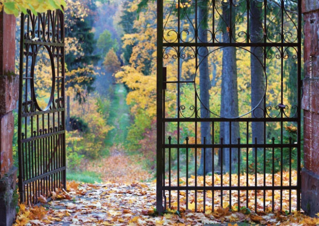 Ein herbstliches Tor, weit geöffnet – ein Bild für Abschied, Weite, Frieden und den letzten Weg.